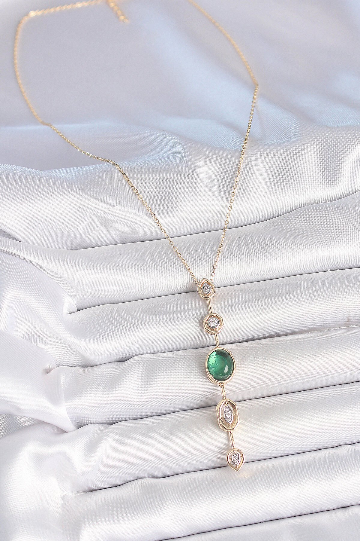 Pirinç Zincir Zümrüt Yeşil Gold Renk Zirkon Taşlı Y Kolye e_BKO10229