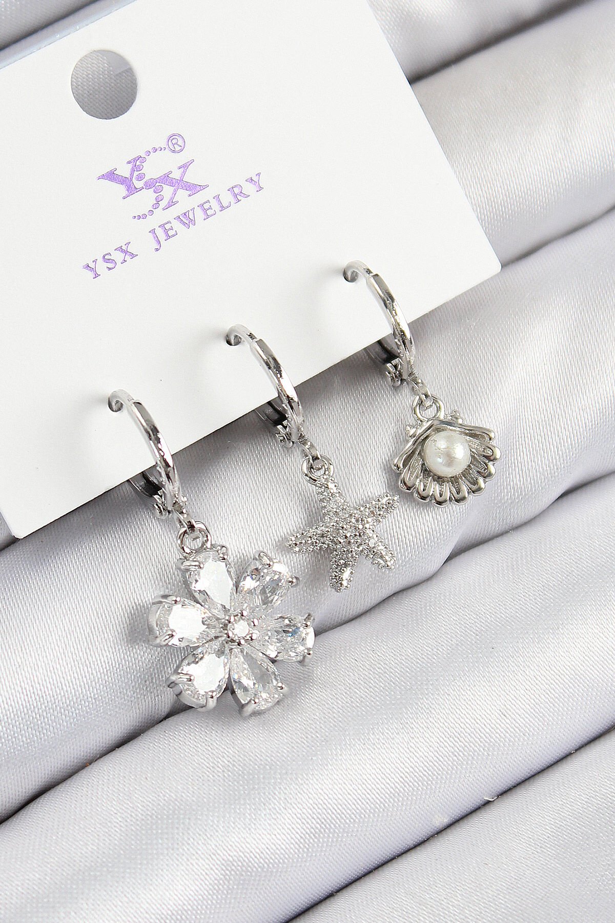 Pirinç Zirkon Taşlı 3'lü Çiçek Ve İstiridye Model Gümüş Renk Kadın Küpe