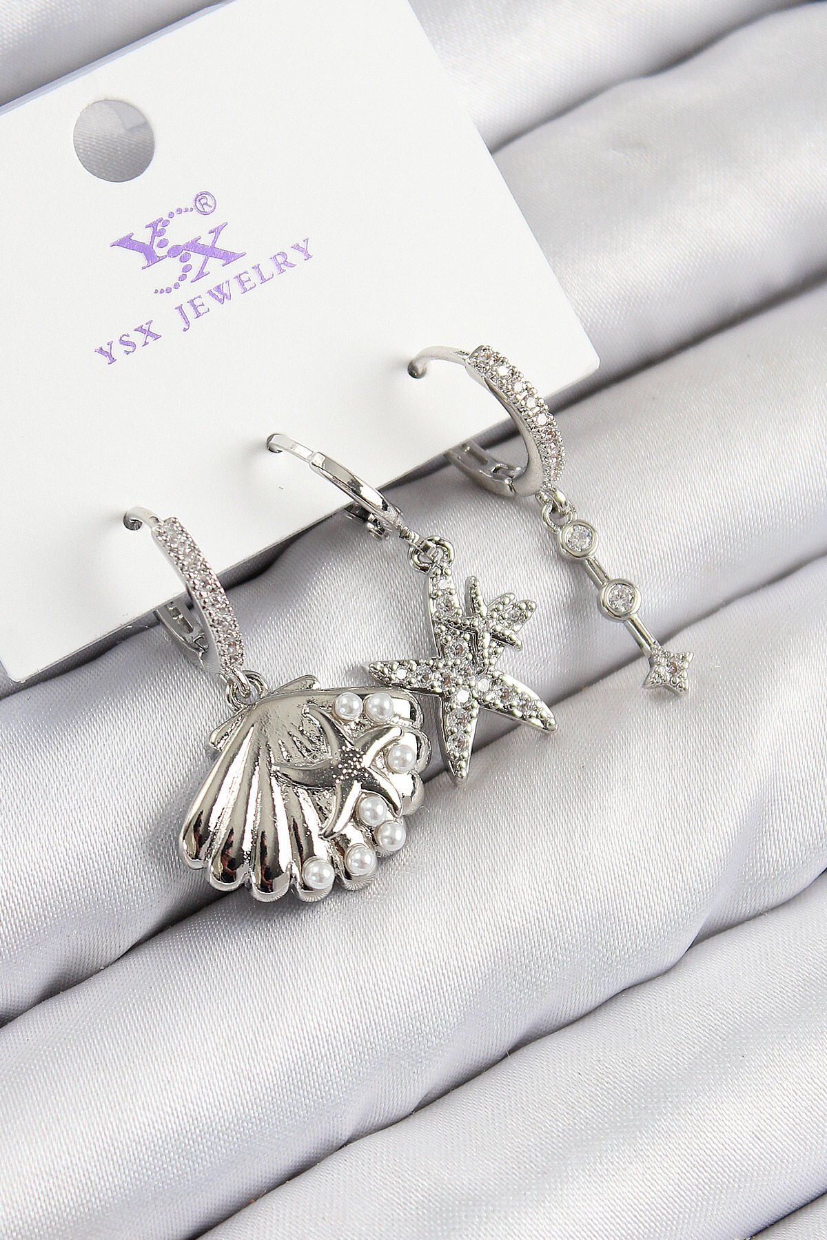 Pirinç Zirkon Taşlı 3'lü Yıldız Ve İstiridye Model Gümüş Renk Kadın Küpe
