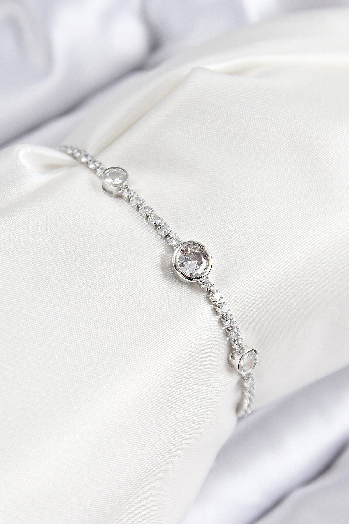 Pirinç Zirkon Taşlı Daire Model Gümüş Renk Asansörlü Kadın Bileklik