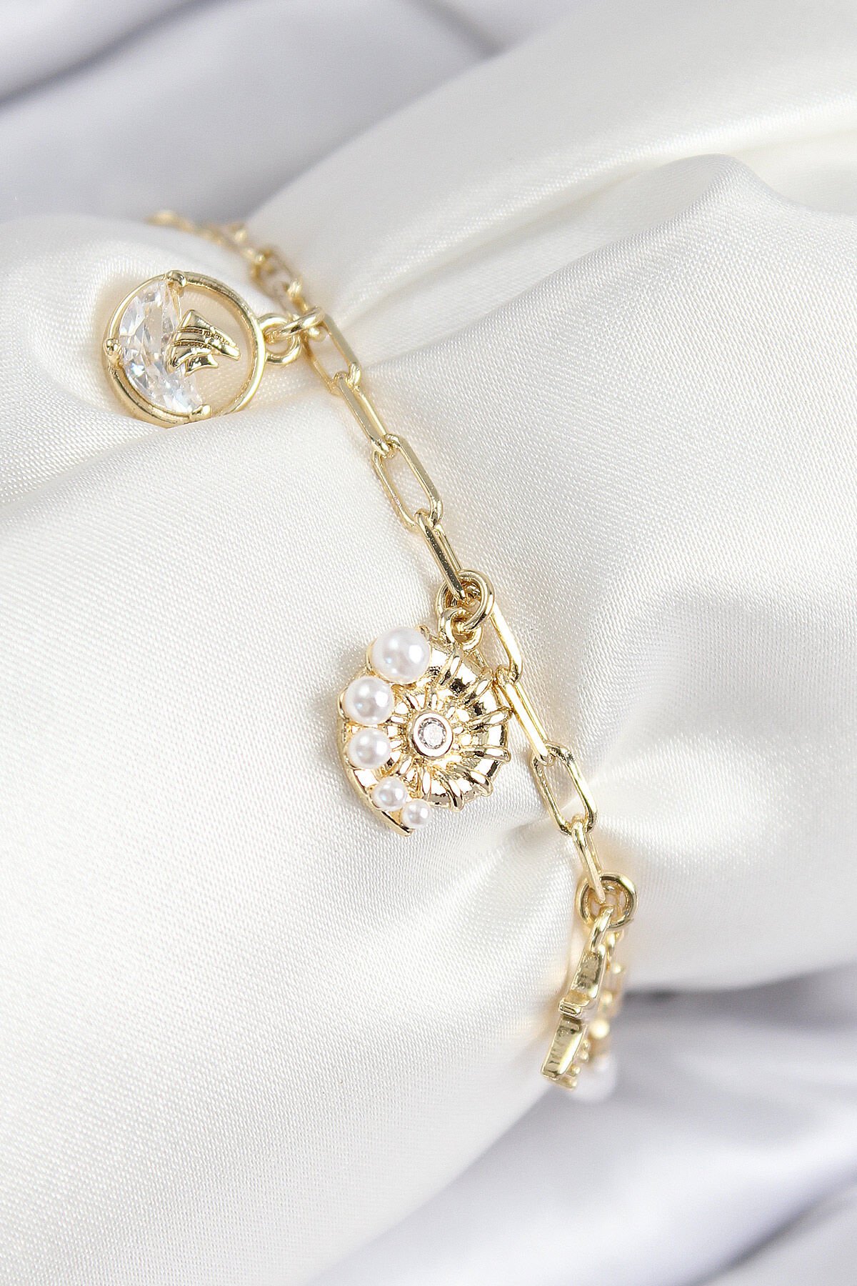 Pirinç Zirkon Taşlı Deniz Kabuğu Model Gold Renk Kadın Bileklik