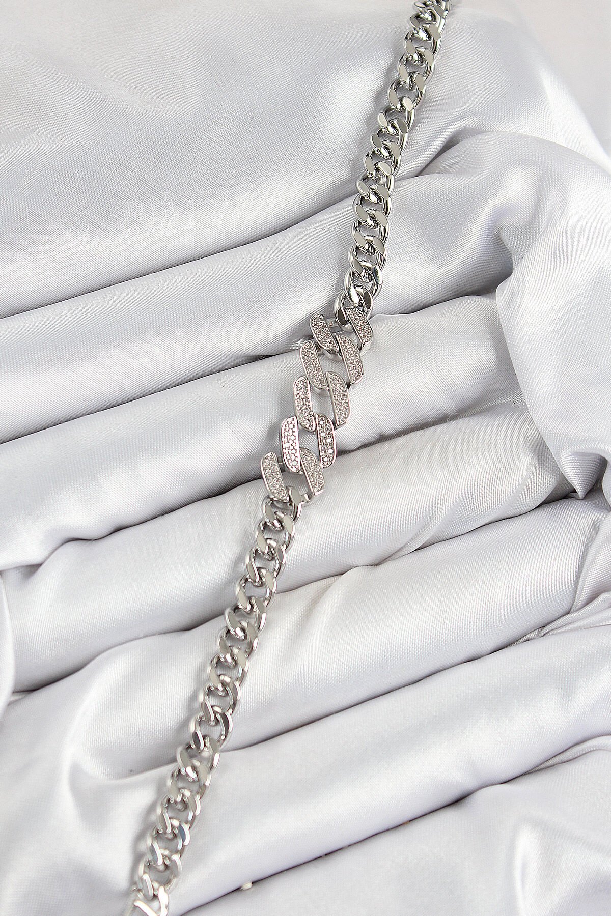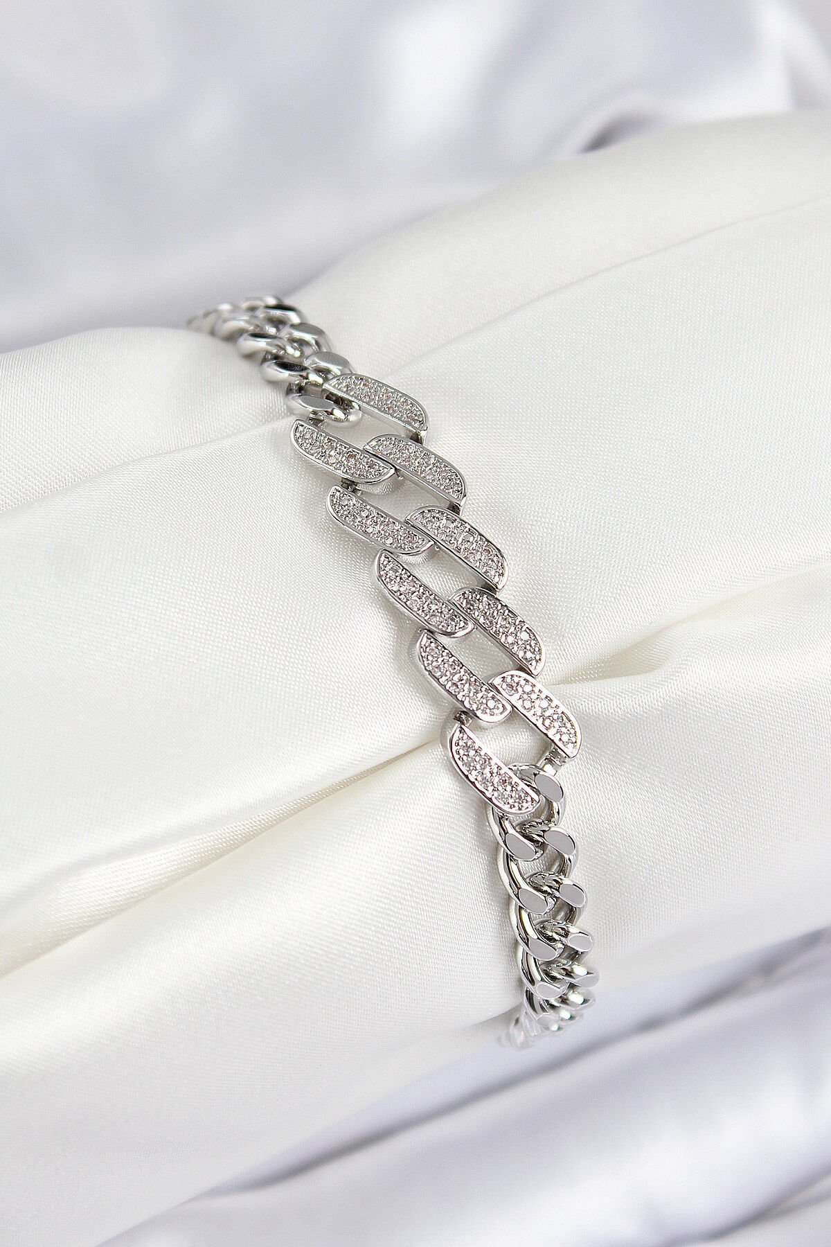 Pirinç Zirkon Taşlı Ezme Küba Zincir Model Gümüş Renk Kadın Bileklik