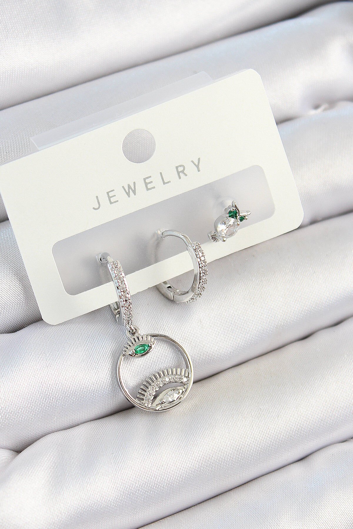 Pirinç Zirkon Taşlı Göz Ve Baykuş Model Gümüş Renk 3'lü Çift Kadın Küpe Set