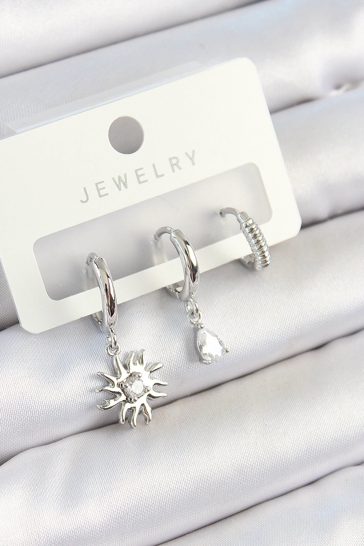 Pirinç Zirkon Taşlı Güneş Model Gümüş Renk 3'lü Çift Kadın Küpe Set