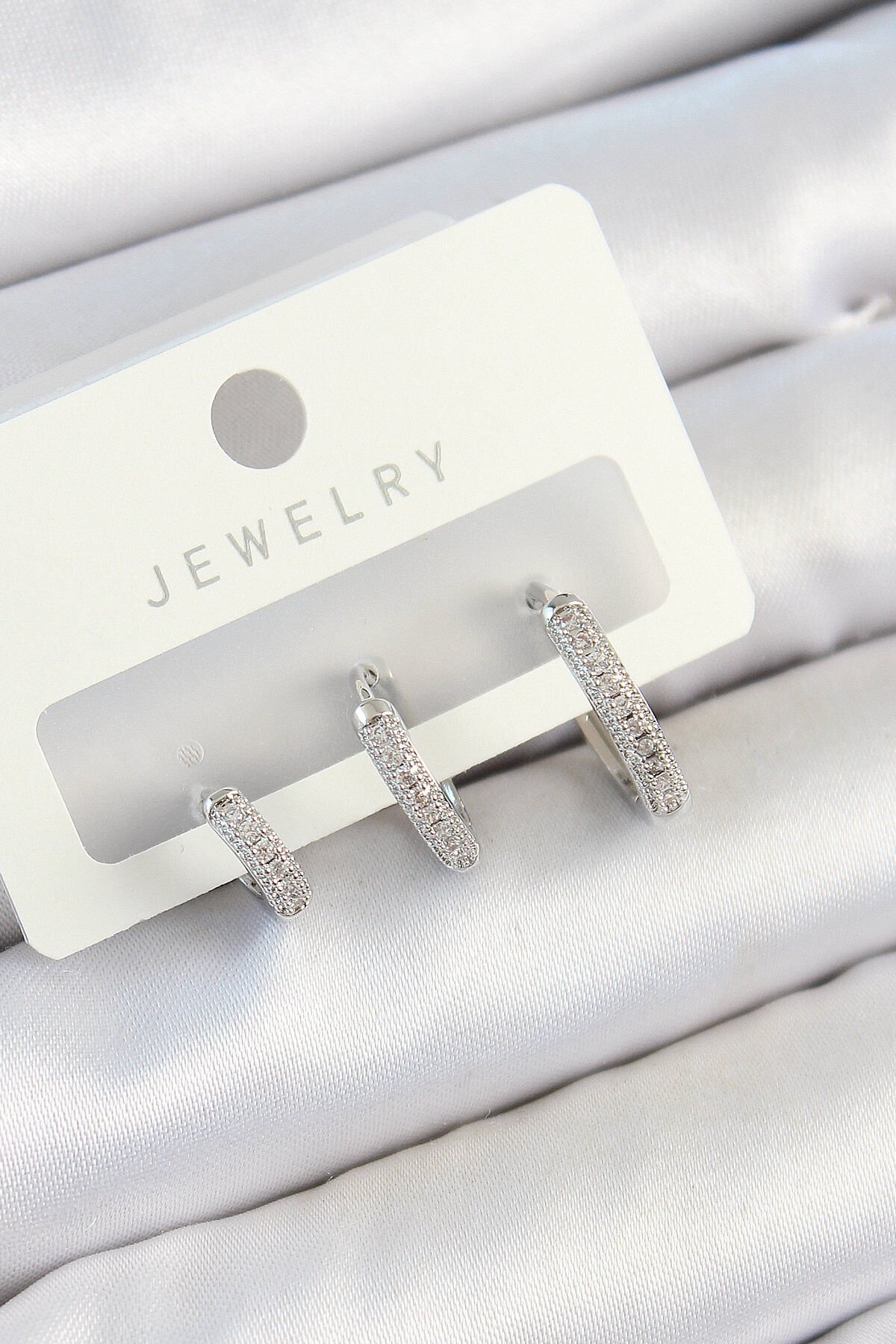 Pirinç Zirkon Taşlı Halka Model Gümüş Renk 3'lü Çift Kadın Küpe Set e_BKP10793