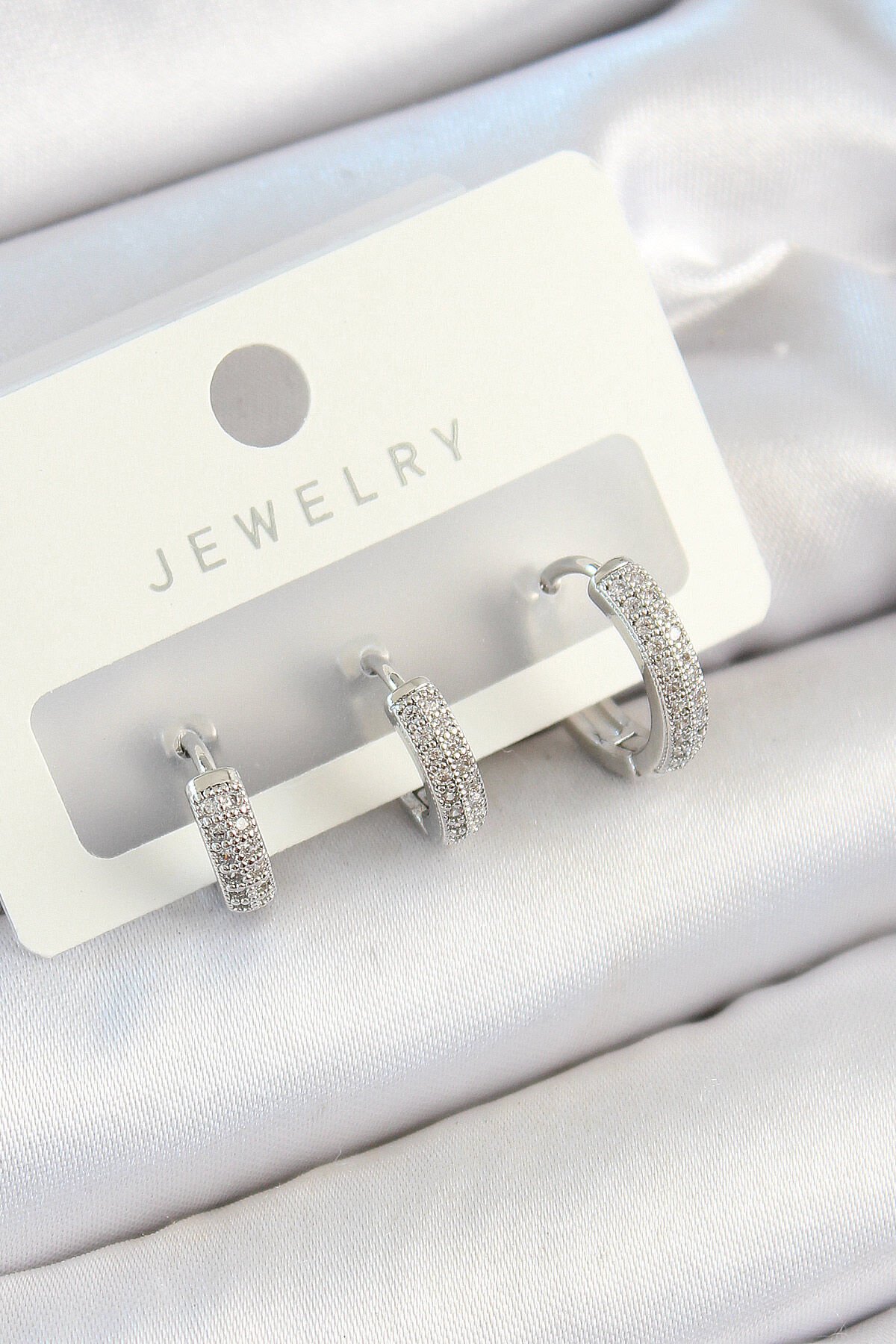 Pirinç Zirkon Taşlı Halka Model Gümüş Renk 3'lü Çift Kadın Küpe Set e_BKP10812
