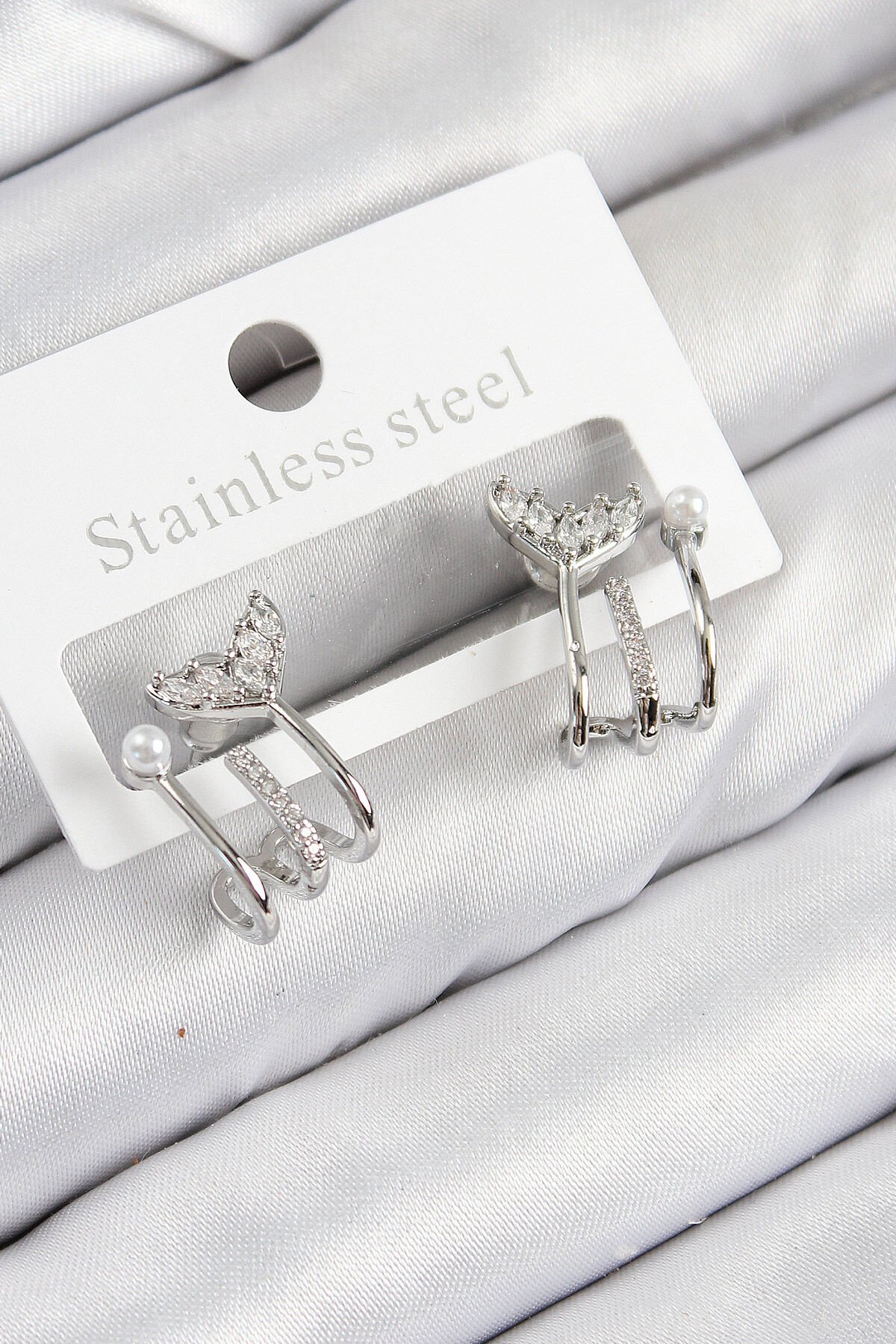 Pirinç Zirkon Taşlı İnci Detaylı Balık Kuyruğu Model Gümüş Renk Kadın Küpe