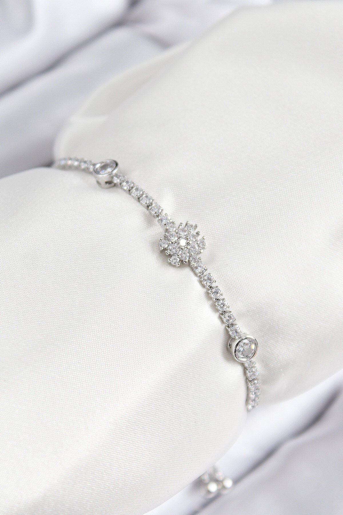 Pirinç Zirkon Taşlı Kar Tanesi Model Gümüş Renk Asansörlü Kadın Bileklik