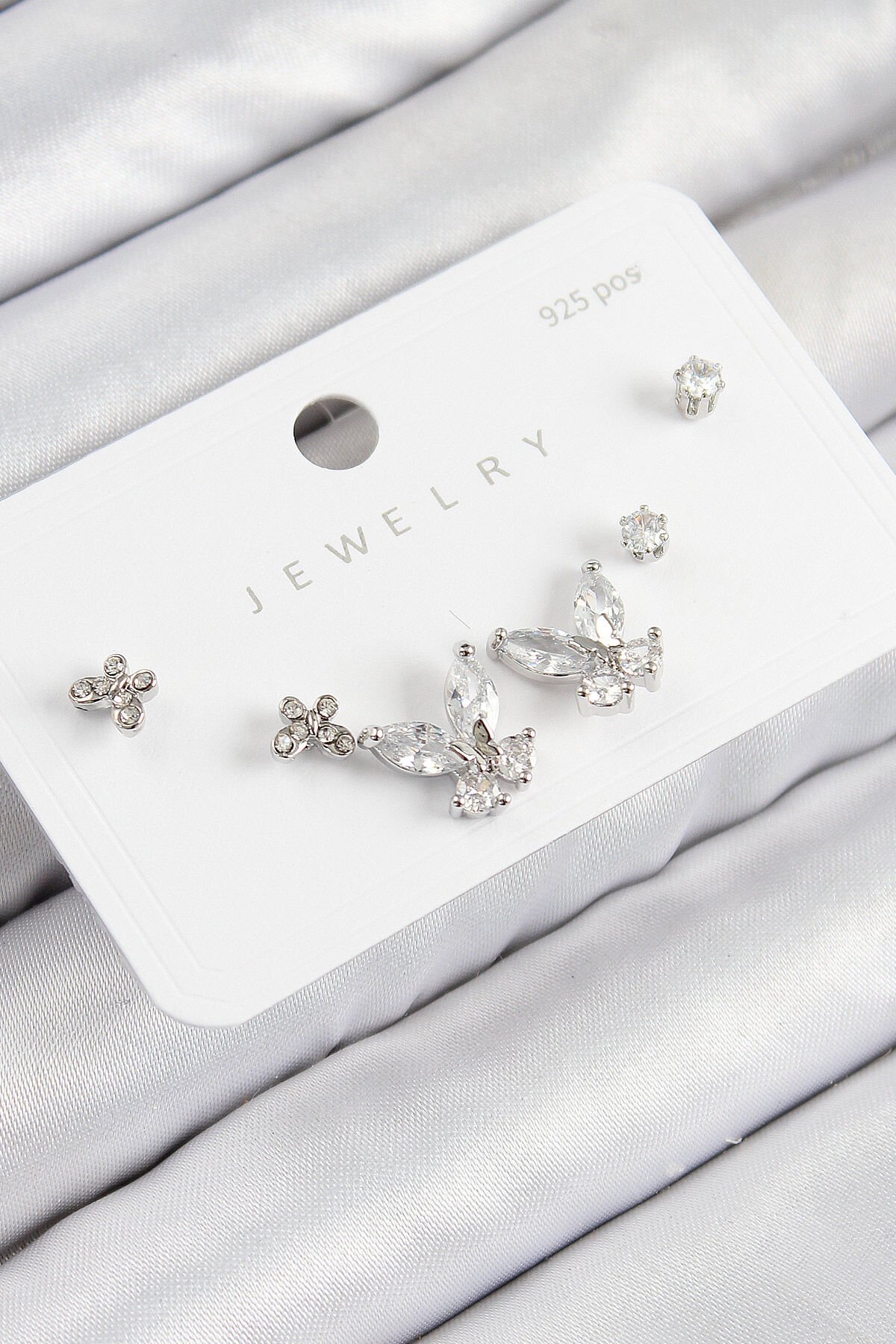 Pirinç Zirkon Taşlı Kelebek Model Gümüş Renk 925 Ayar Gümüş Çivi Kadın Küpe Set