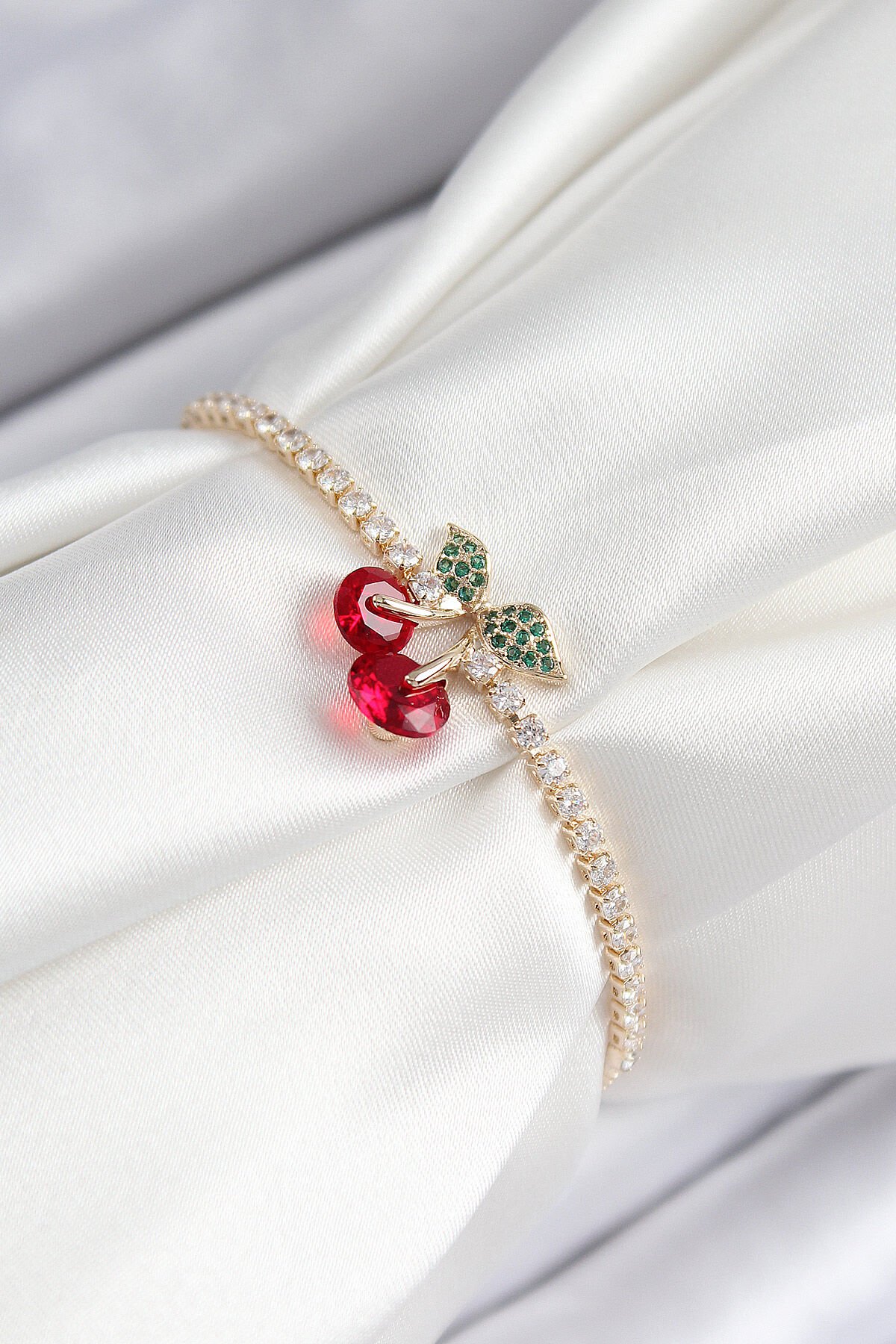 Pirinç Zirkon Taşlı Kiraz Model Gold Renk Asansörlü Kadın Bileklik