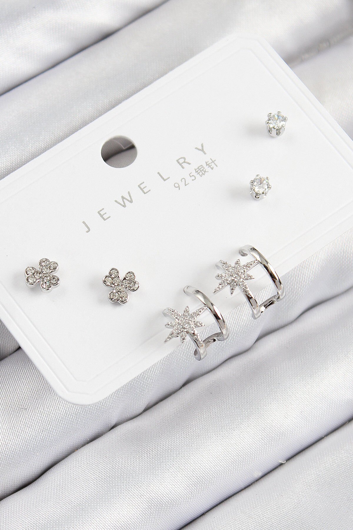 Pirinç Zirkon Taşlı Kutup Yıldızı Model Gümüş Renk 925 Ayar Gümüş Çivi Kadın Küpe Set