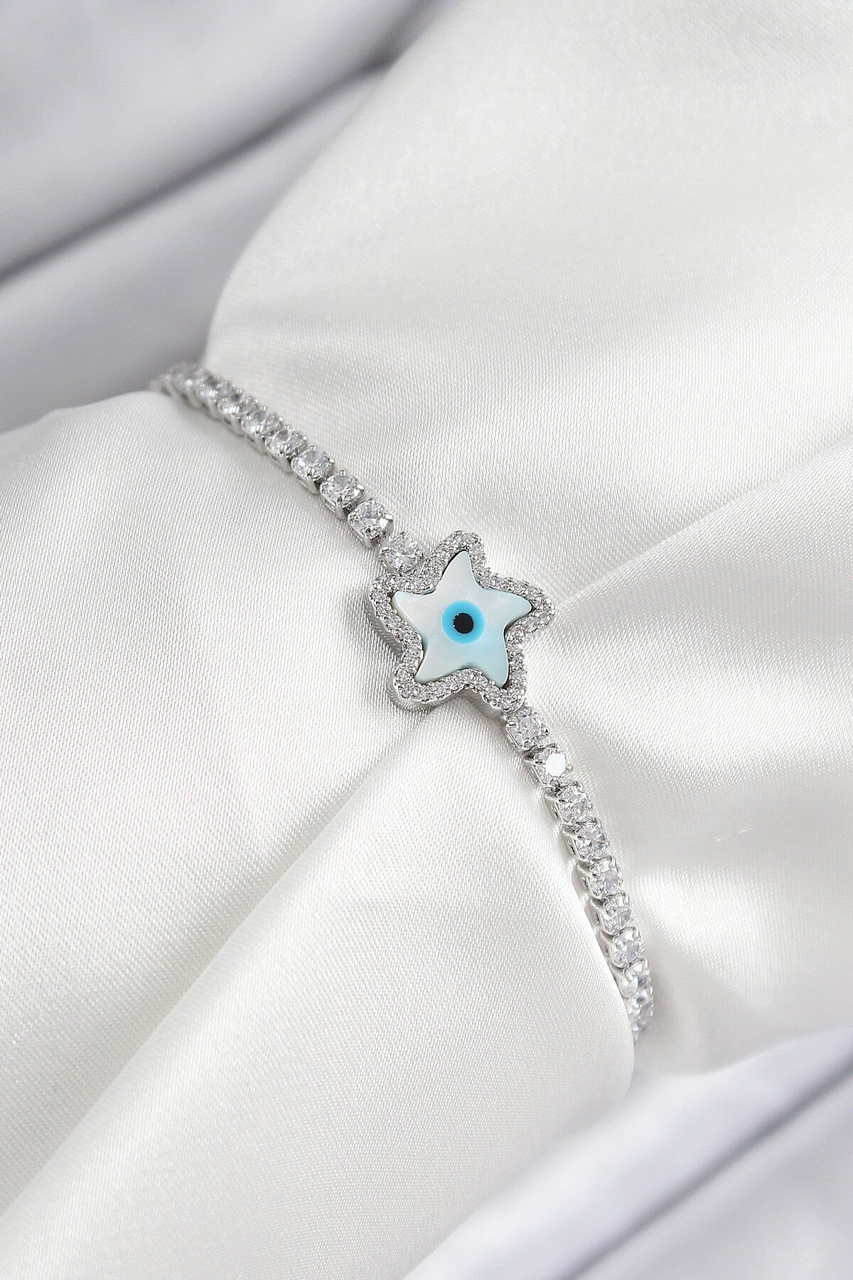 Pirinç Zirkon Taşlı Nazar Yıldız Model Gümüş Renk Asansörlü Kadın Bileklik