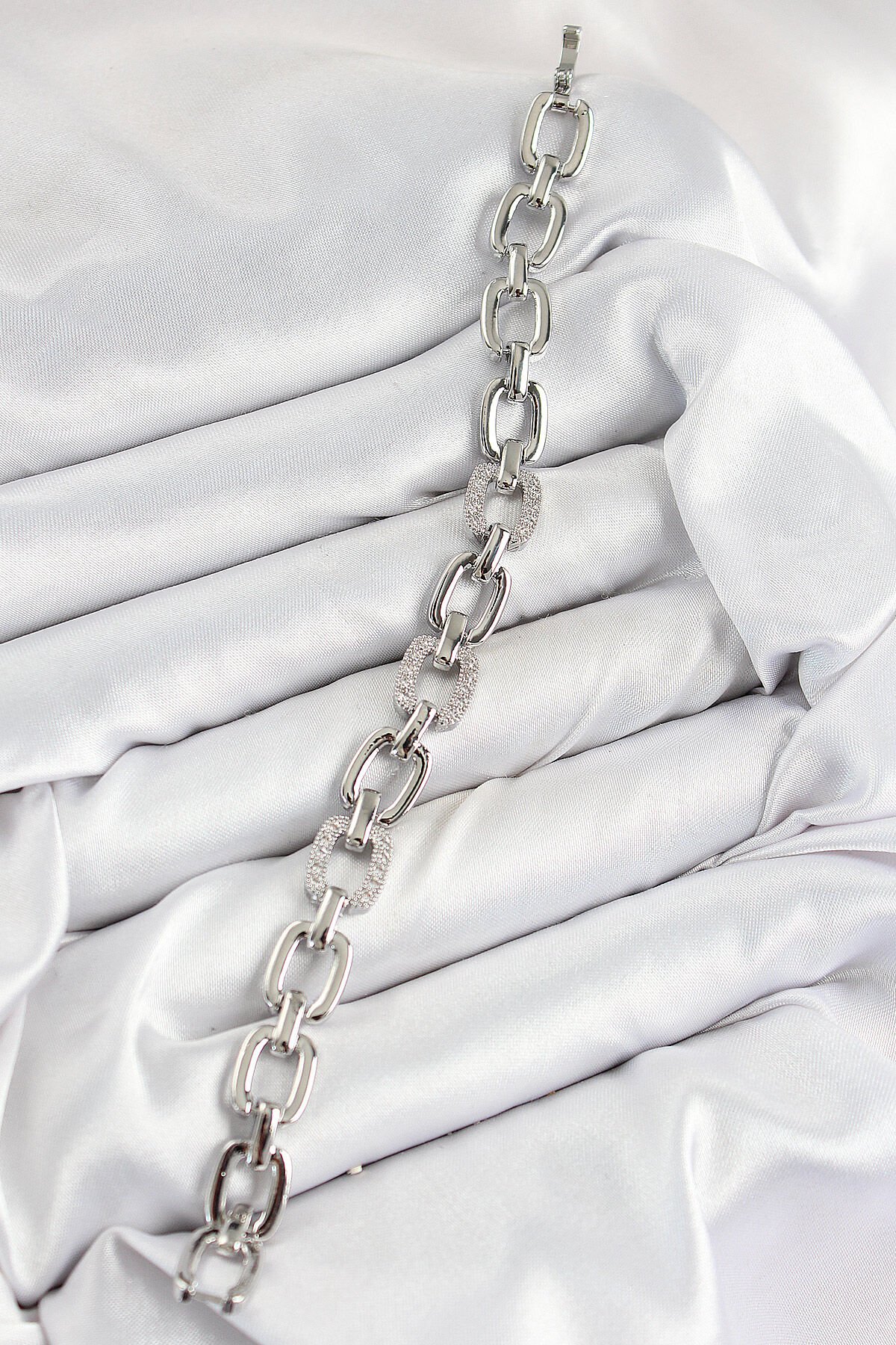 Pirinç Zirkon Taşlı Parçalı Zincir Model Gümüş Renk Kadın Bileklik