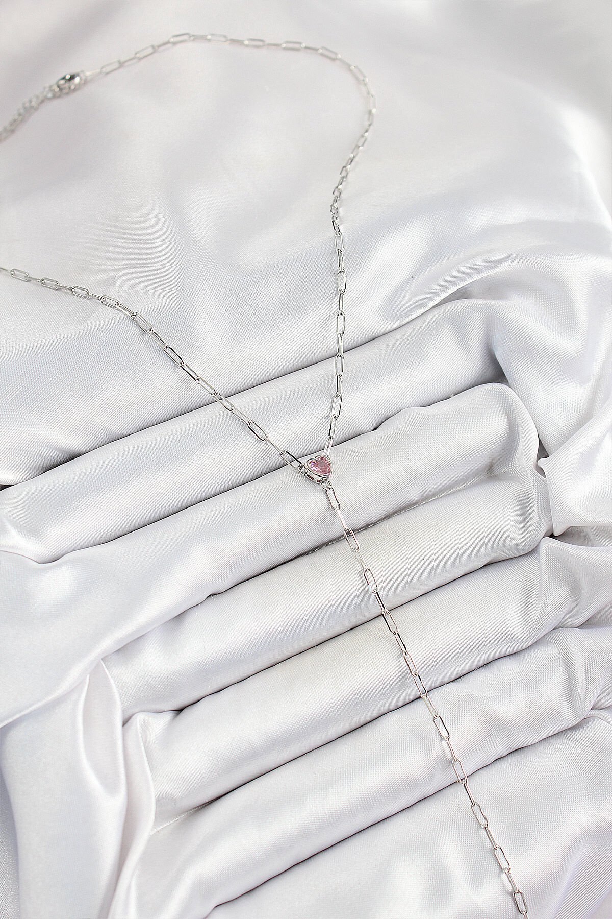 Pirinç Zirkon Taşlı Pembe Kalp Figürlü Y Model Gümüş Renk Kadın Kolye