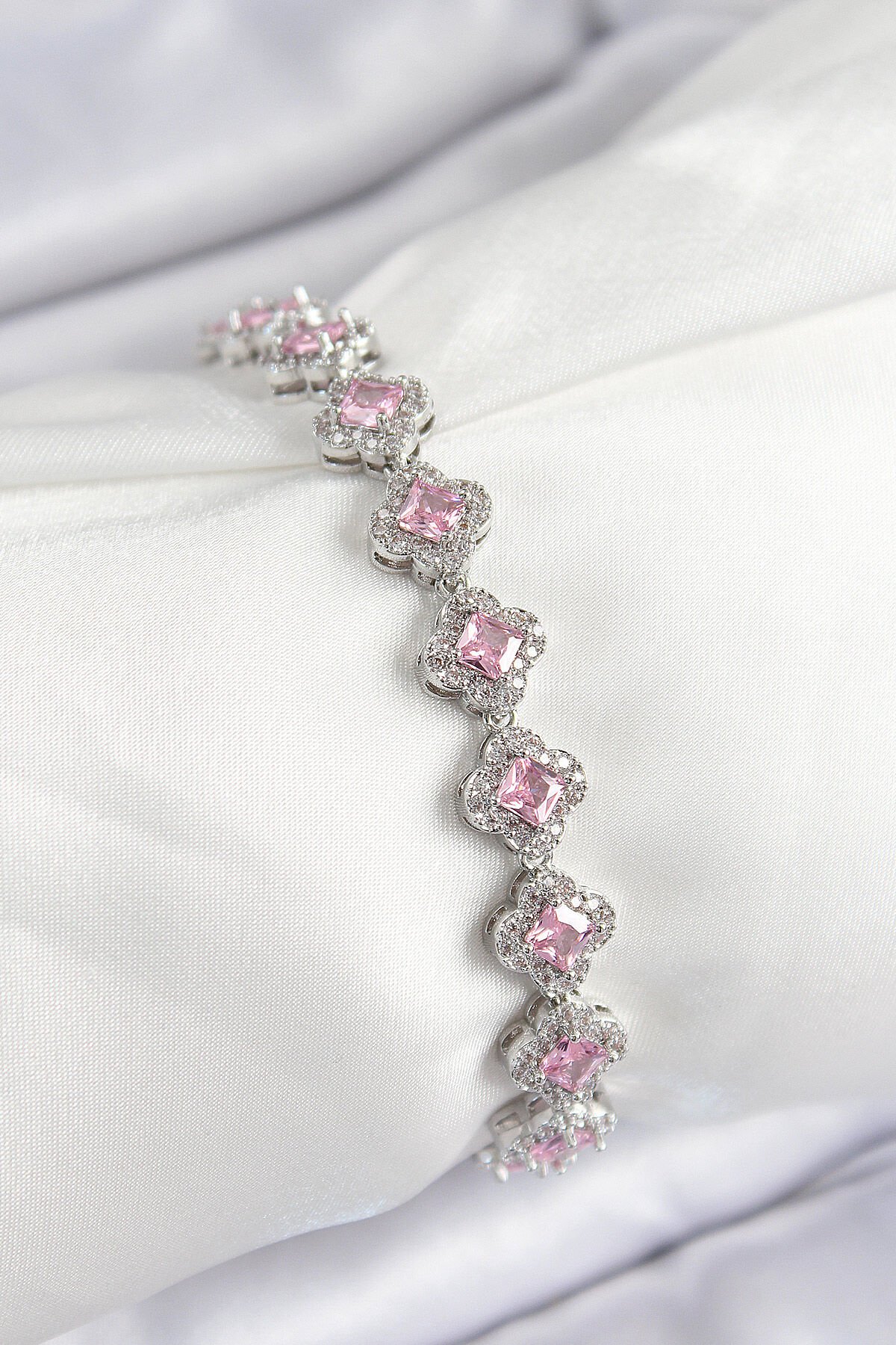 Pirinç Zirkon Taşlı Pembe Yonca Baget Model Gümüş Renk VIP Seri Kadın Bileklik
