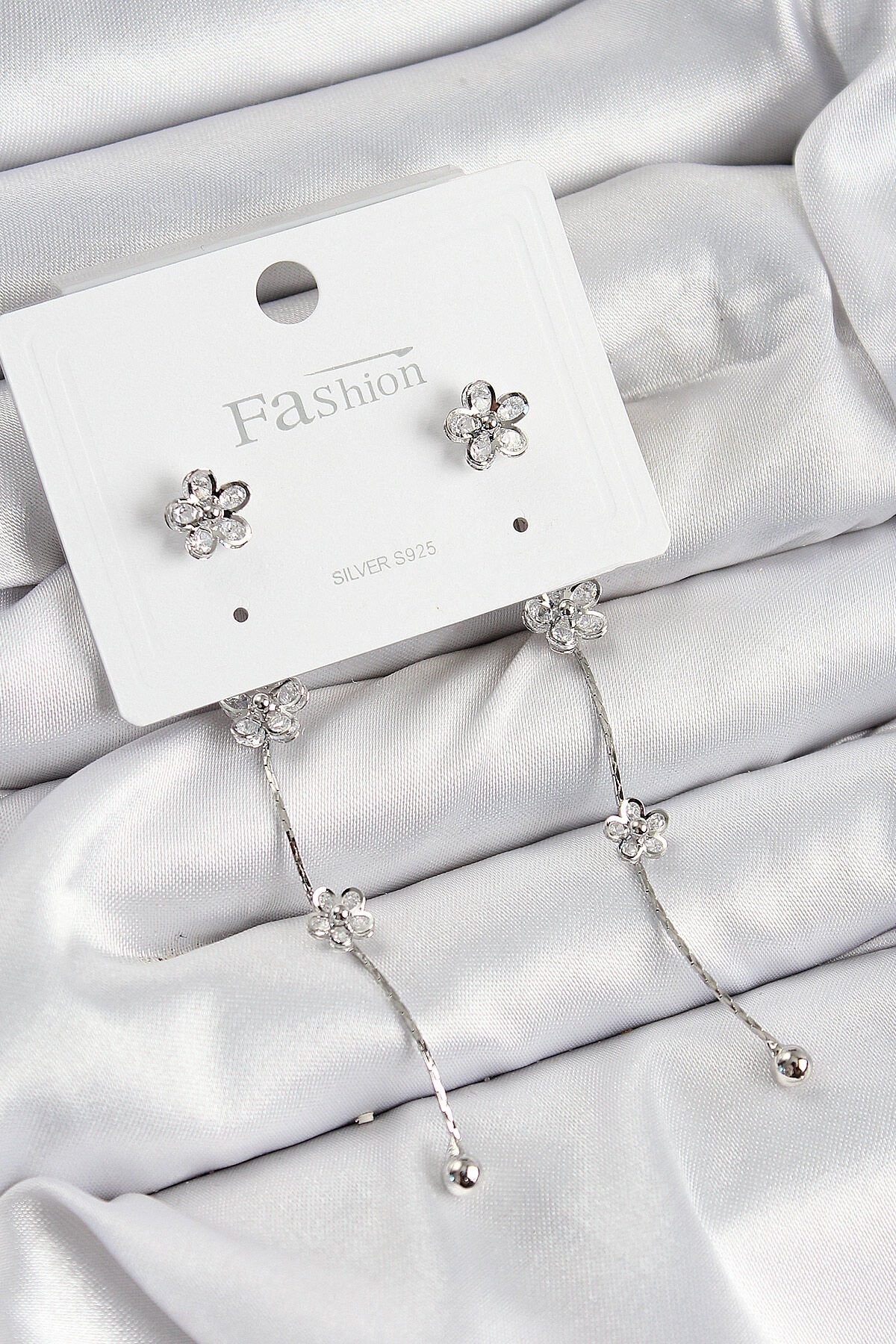 Pirinç Zirkon Taşlı Sallantılı Çiçek Model Gümüş Renk 925 Ayar Gümüş Çivi Kadın Küpe