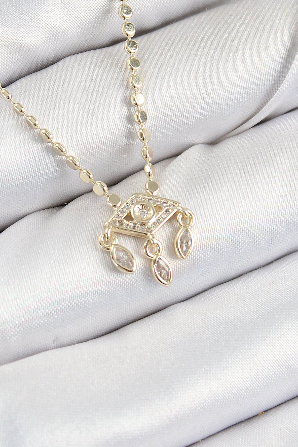 Pirinç Zirkon Taşlı Sallantılı Göz Model Ezme Zincir Gold Renk Kadın Kolye