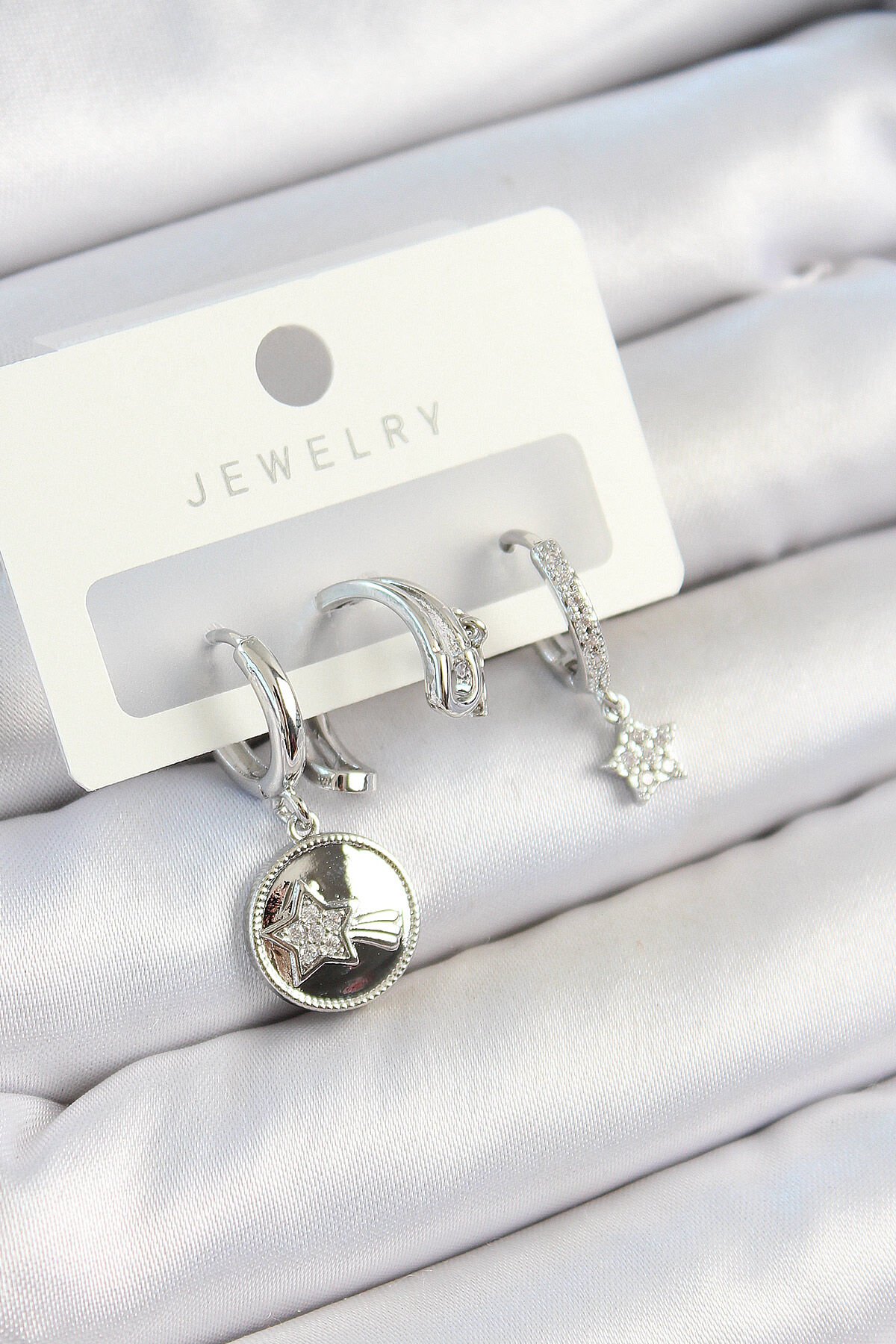 Pirinç Zirkon Taşlı Sallantılı Yıldız Model Gümüş Renk 3'lü Çift Kadın Küpe Set