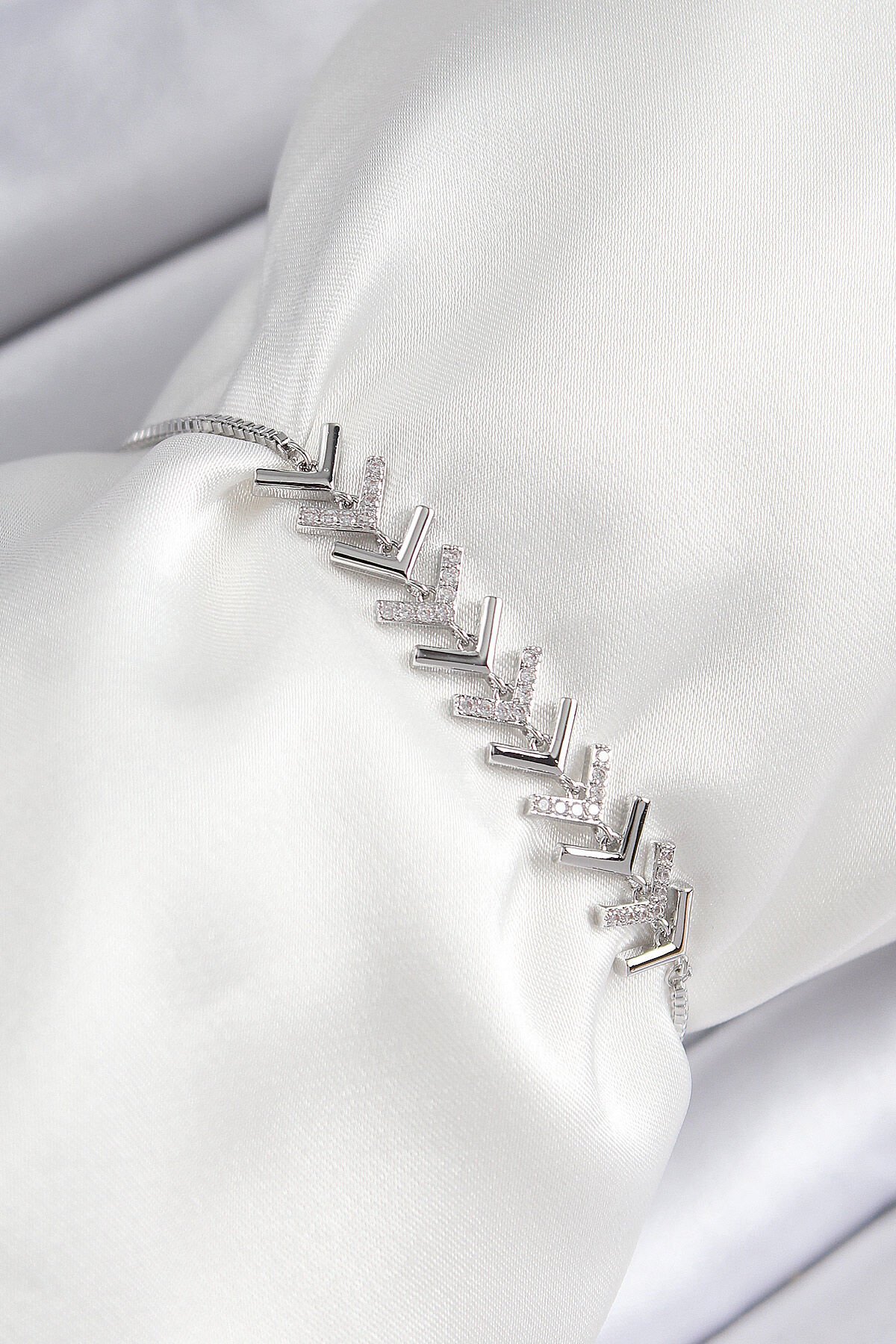 Pirinç Zirkon Taşlı Sıralı Ok Model Gümüş Renk Asansörlü Kadın Bileklik