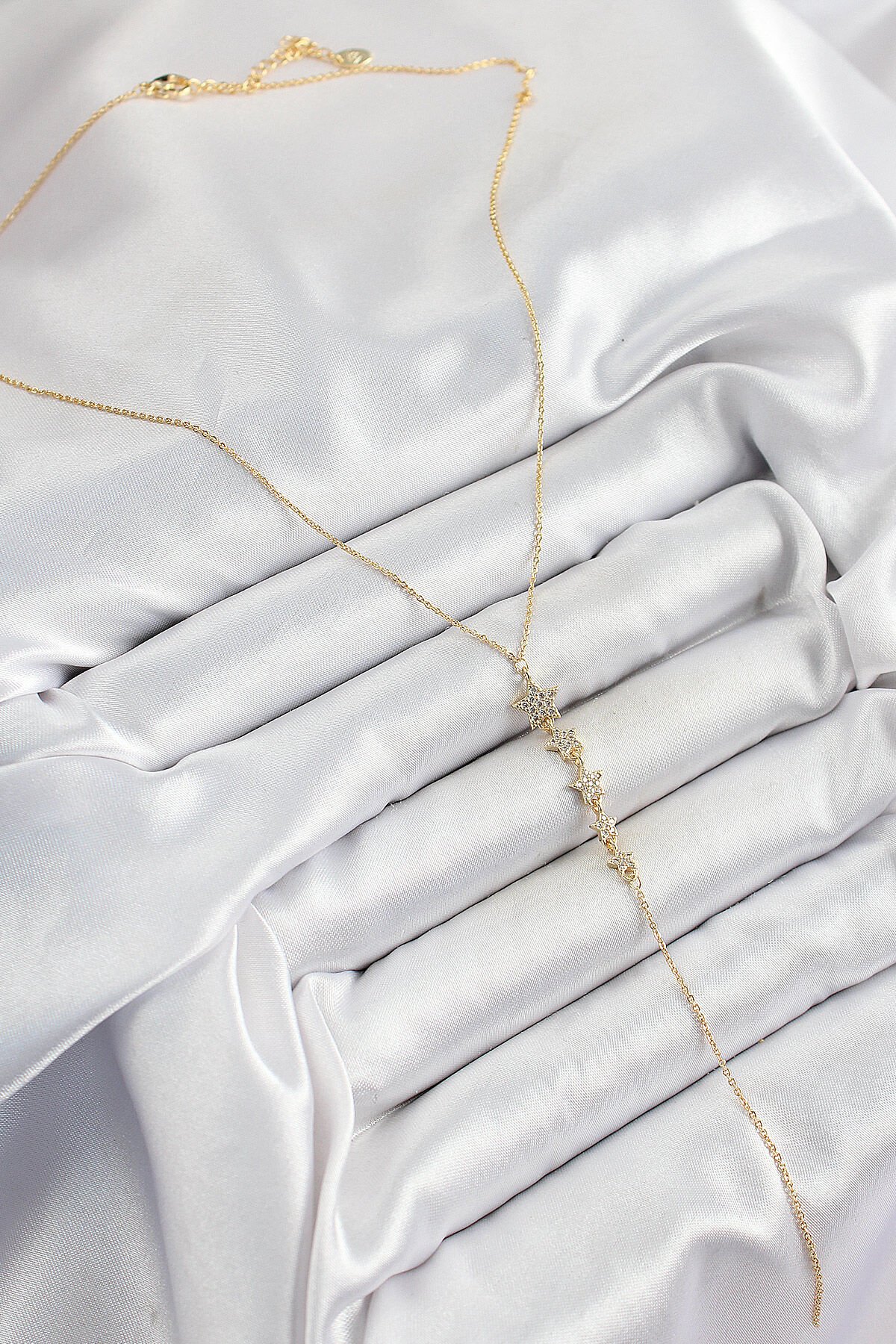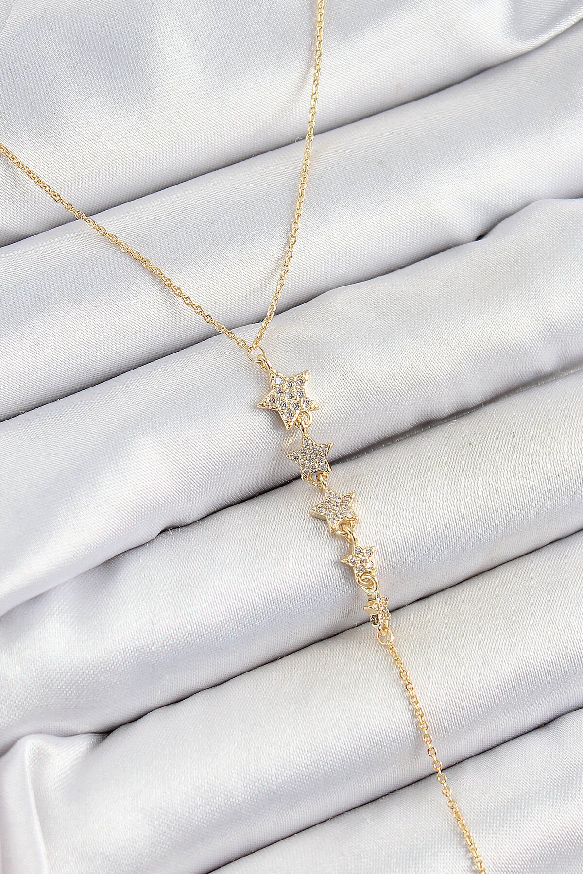 Pirinç Zirkon Taşlı Sıralı Yıldız Figürlü Y Model Gold Renk Kadın Kolye