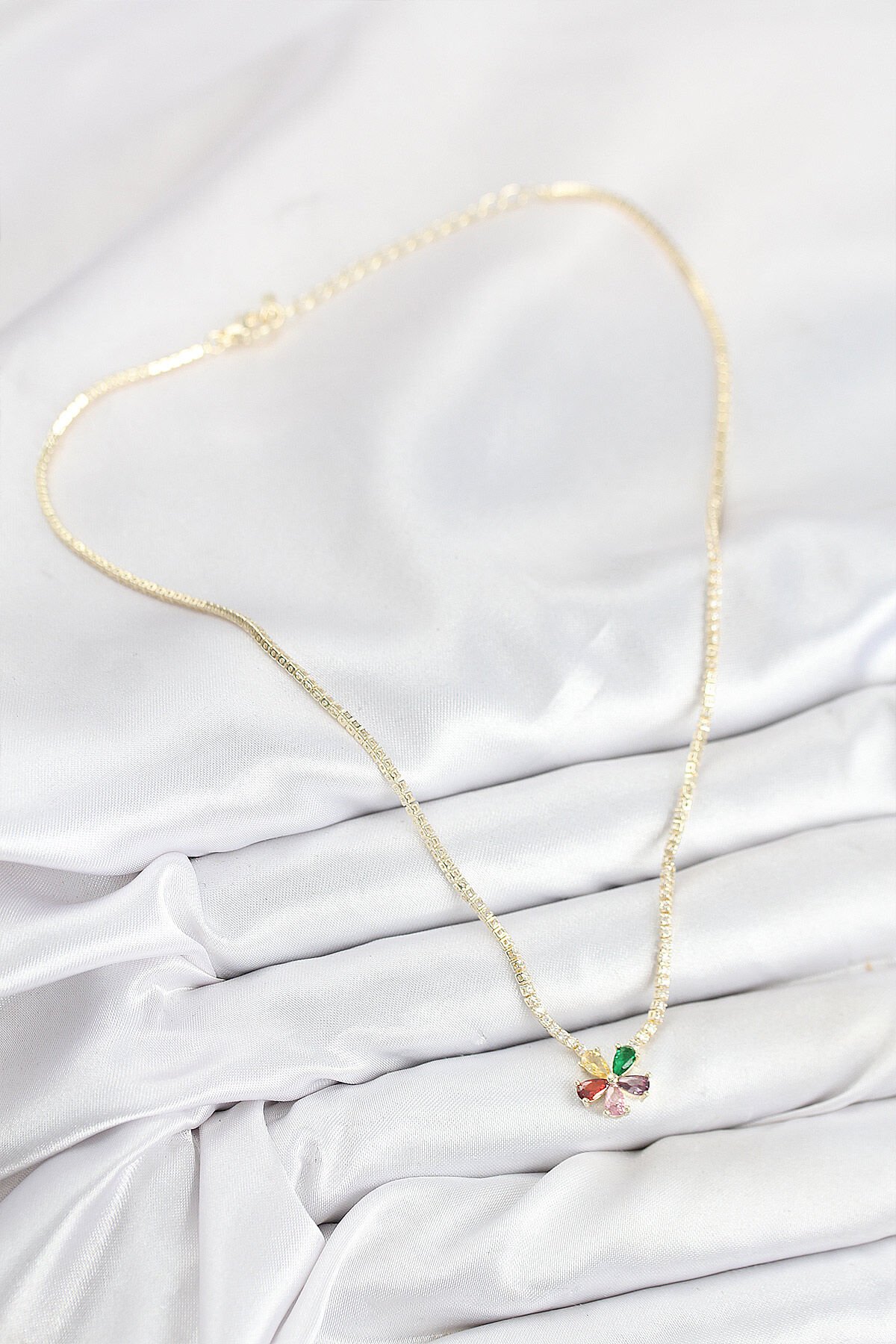 Pirinç Zirkon Taşlı Su Yolu Asorti Çiçek Model Gold Renk Kadın Kolye
