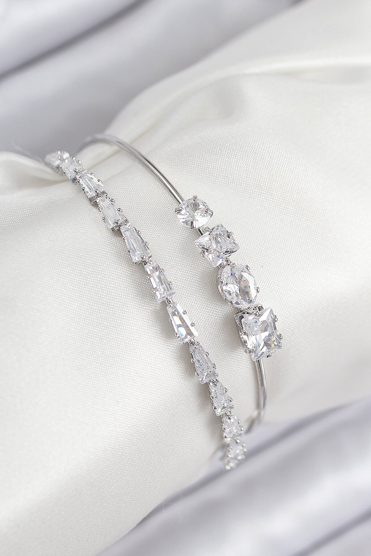 Pirinç Zirkon Taşlı Su Yolu Model Gümüş Renk Kadın Bileklik e_BB7866