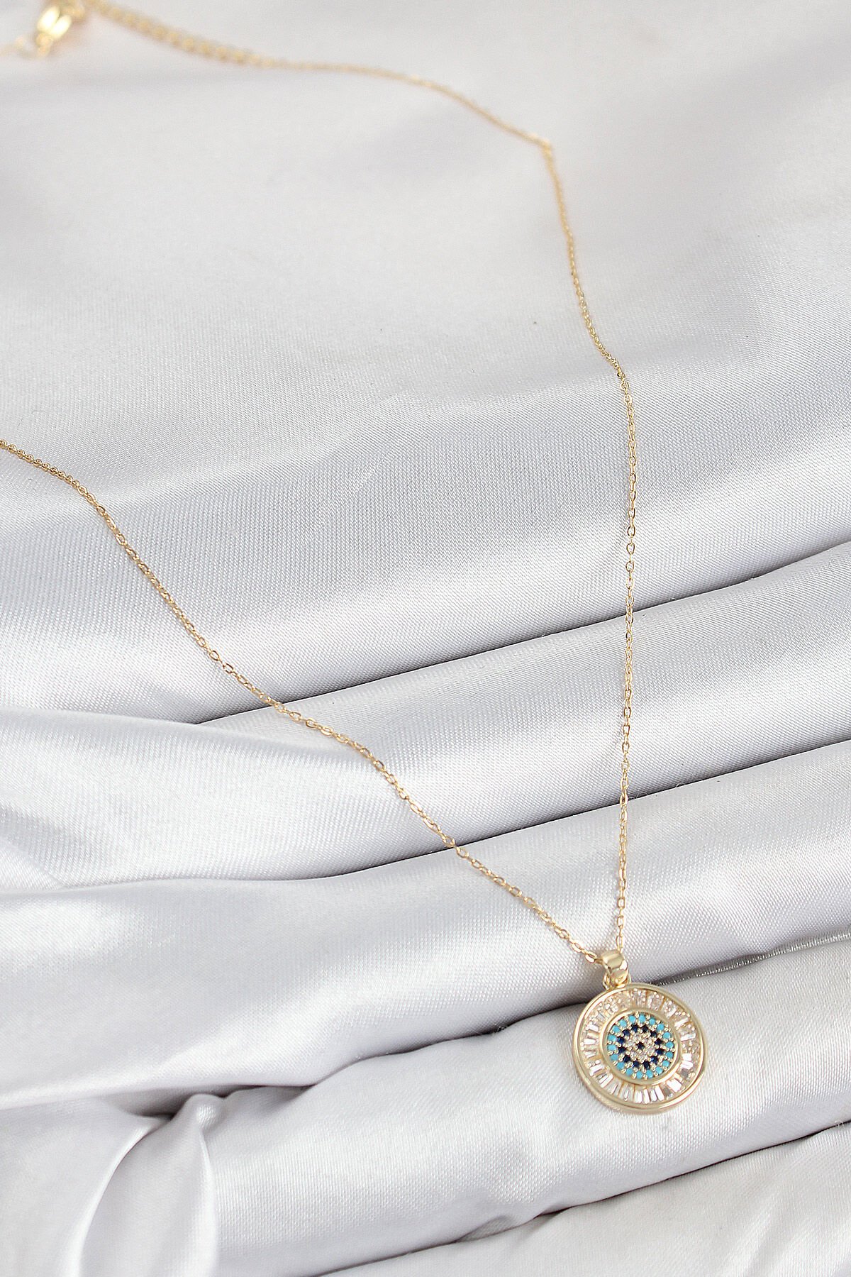 Pirinç Zirkon Taşlı Su Yolu Nazar Model Gold Renk Kadın Kolye e_BKO10428