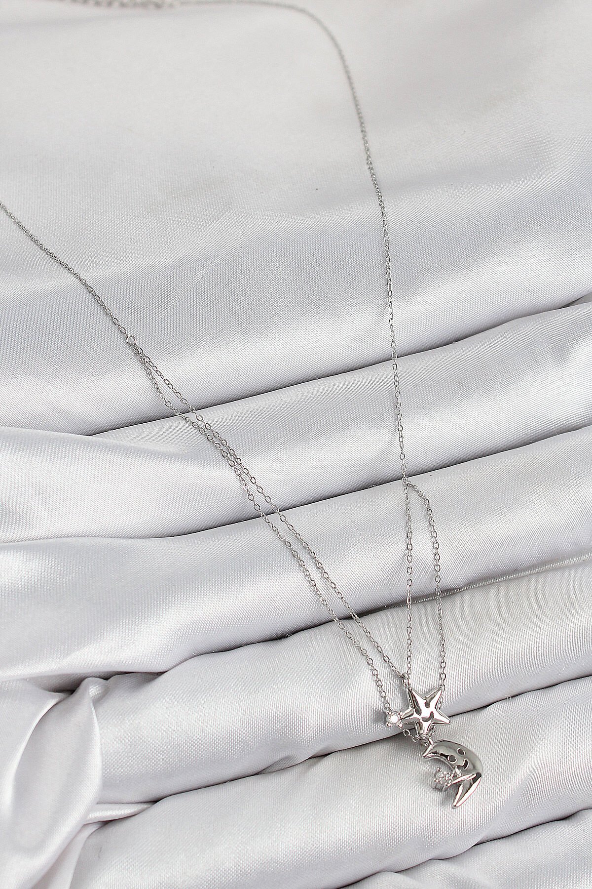 Pirinç Zirkon Taşlı Yıldız Ve Ay Model Gümüş Renk Kadın Kolye