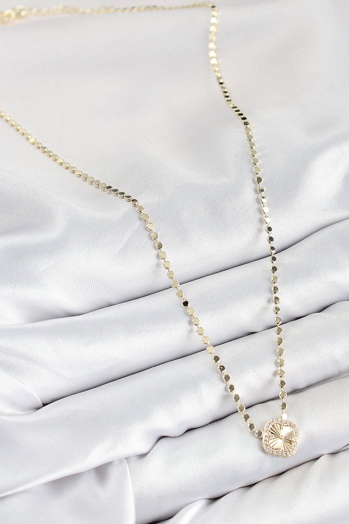 Pirinç Zirkon Taşlı Yonca Model Ezme Zincir Gold Renk Kadın Kolye e_BKO10392