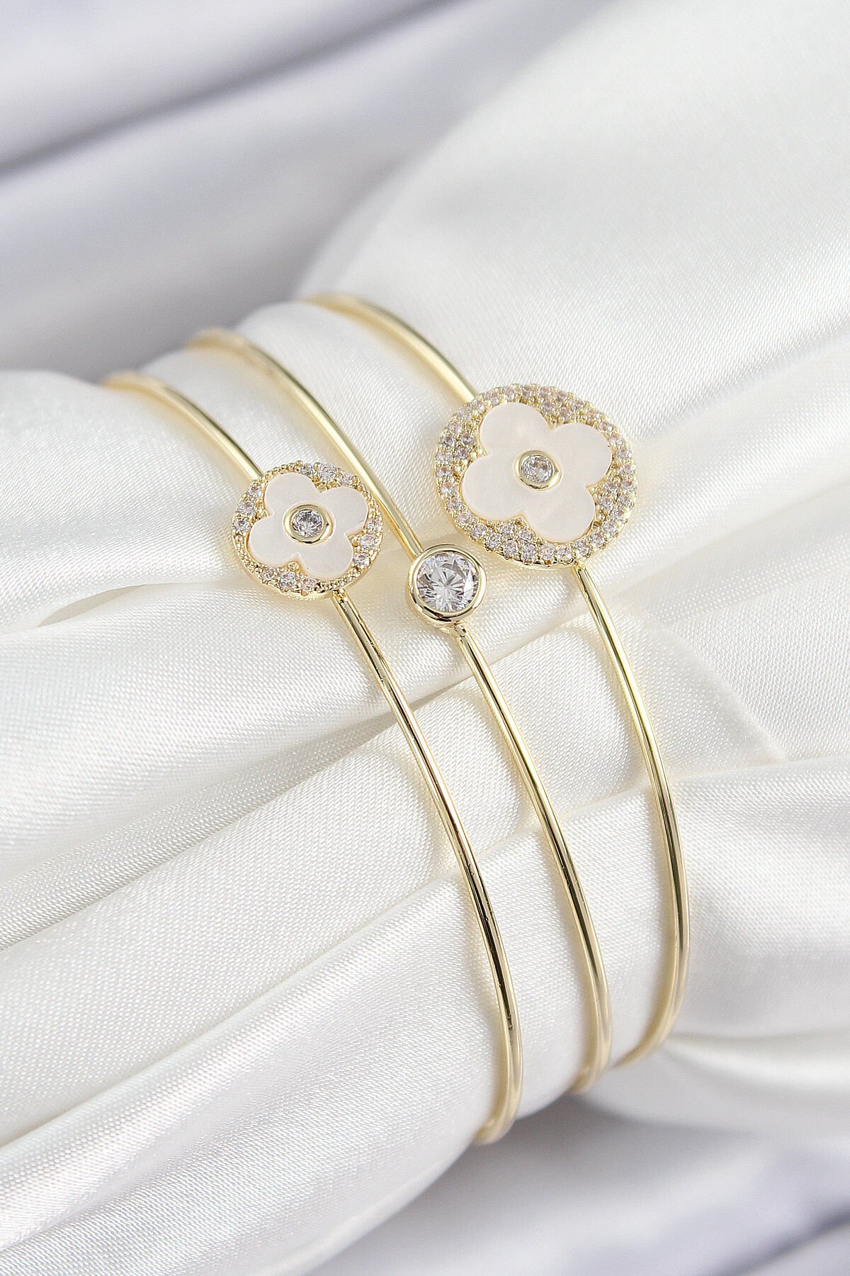 Pirinç Zirkon Taşlı Yonca Model Gold Renk Vip 3'lü Kadın Bileklik