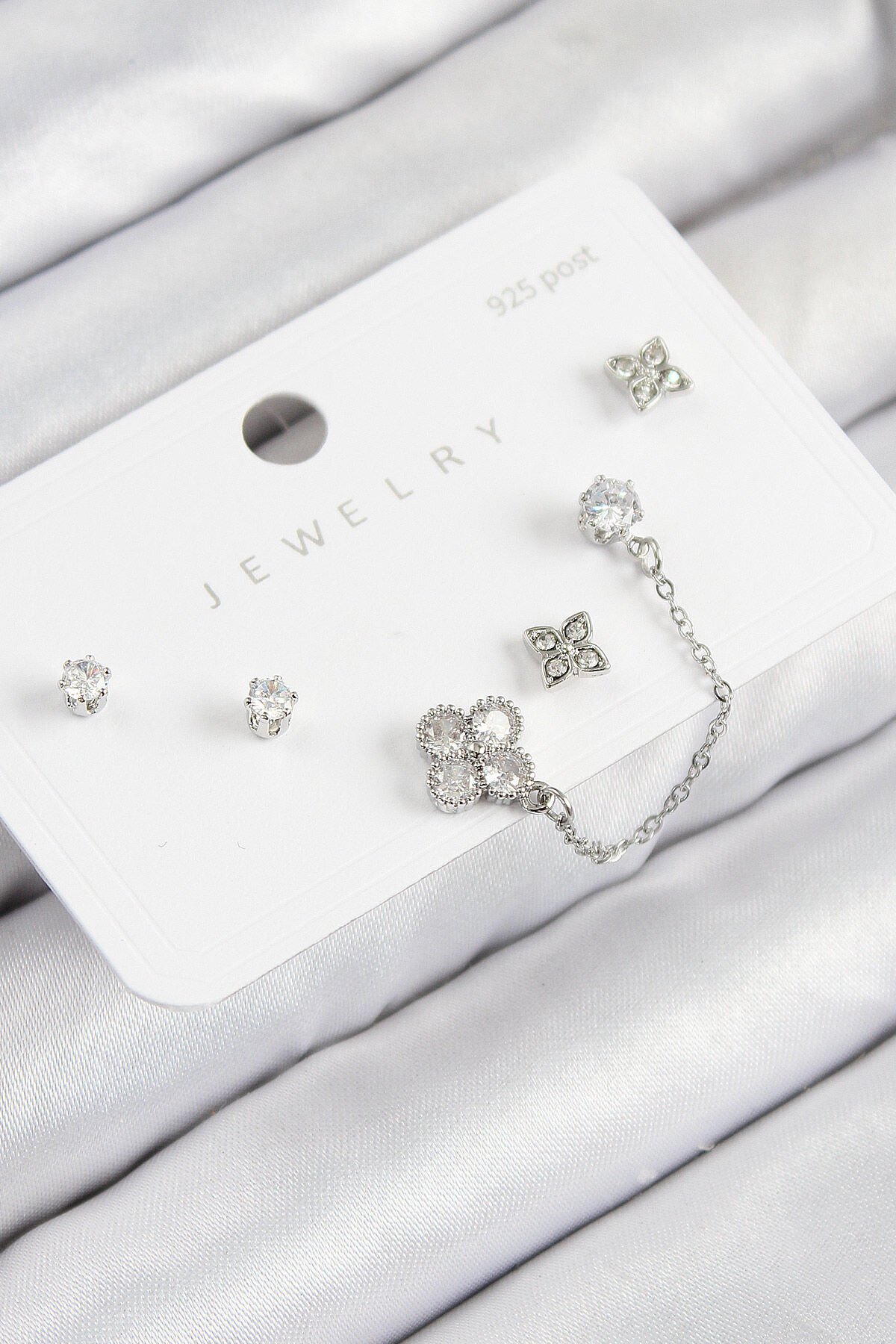 Pirinç Zirkon Taşlı Yonca Model Gümüş Renk 925 Ayar Gümüş Çivi Kadın Küpe Set