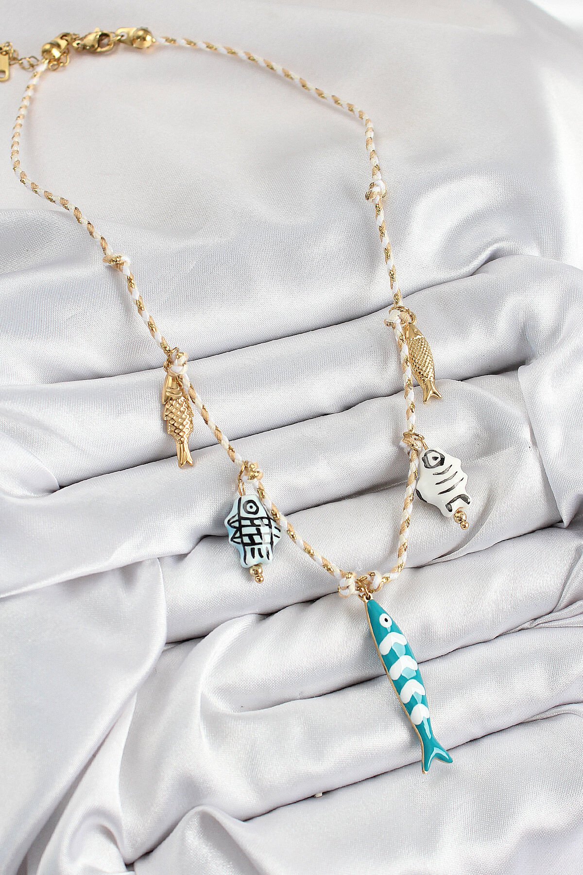 Seramik Motifli Balık Figürlü Model Krem İp Kadın Kolye