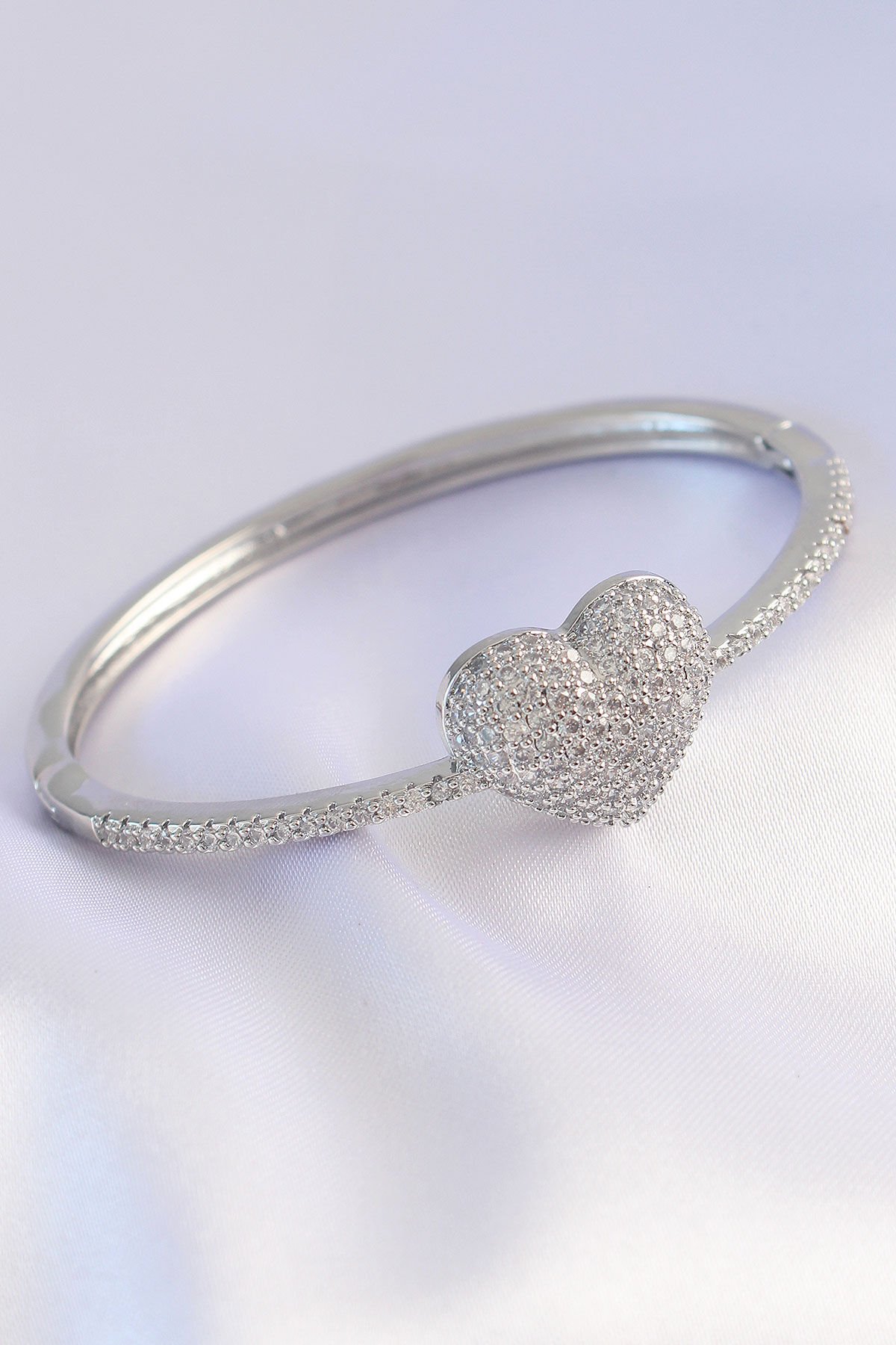 Vip Seri Pirinç Zirkon Taşlı Gümüş Renk Kalp Model Kelepçe e_BB6082